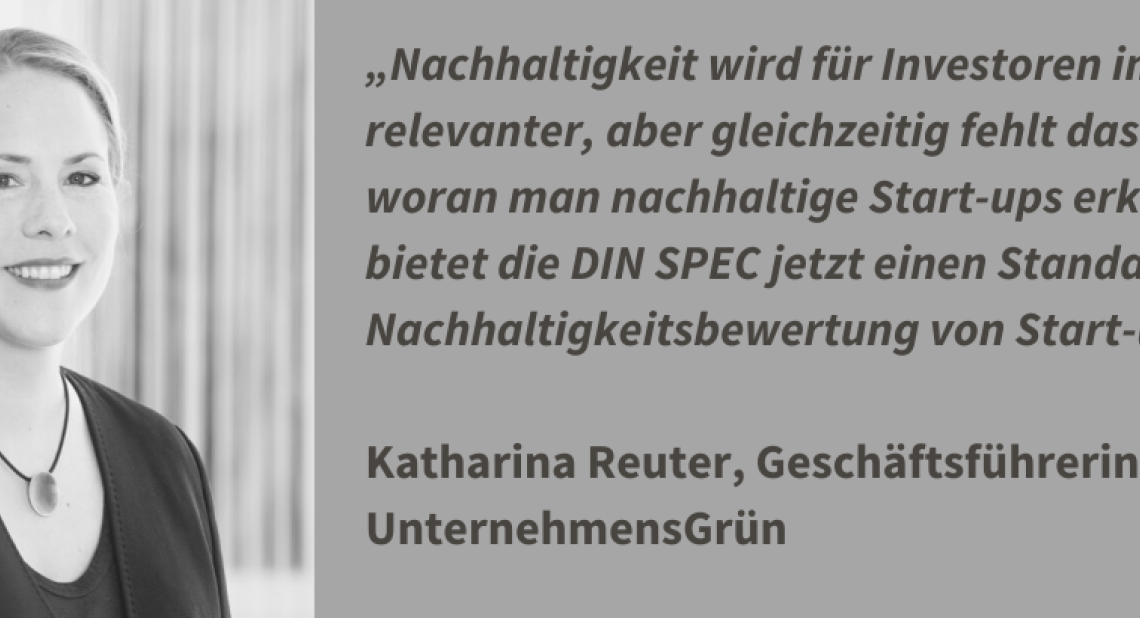 "Wir freuen uns, dass die Arbeiten an der DIN SPEC zur Nachhaltigkeitsbewertung von Start-ups jetzt abgeschlossen sind. Im intensiven Entwicklungsprozess wurde die Expertise von zahlreichen Institutionen einbezogen. Nachhaltigkeit wird auch für Investoren immer relevanter – aber gleichzeitig fehlt das Wissen, woran man nachhaltige Start-ups erkennt. Hier kommt dem neuen Orientierungsrahmen eine wichtige Rolle zu“, führt Dr. Katharina Reuter aus, die den Entwicklungsprozess für UnternehmensGrün begleitete.