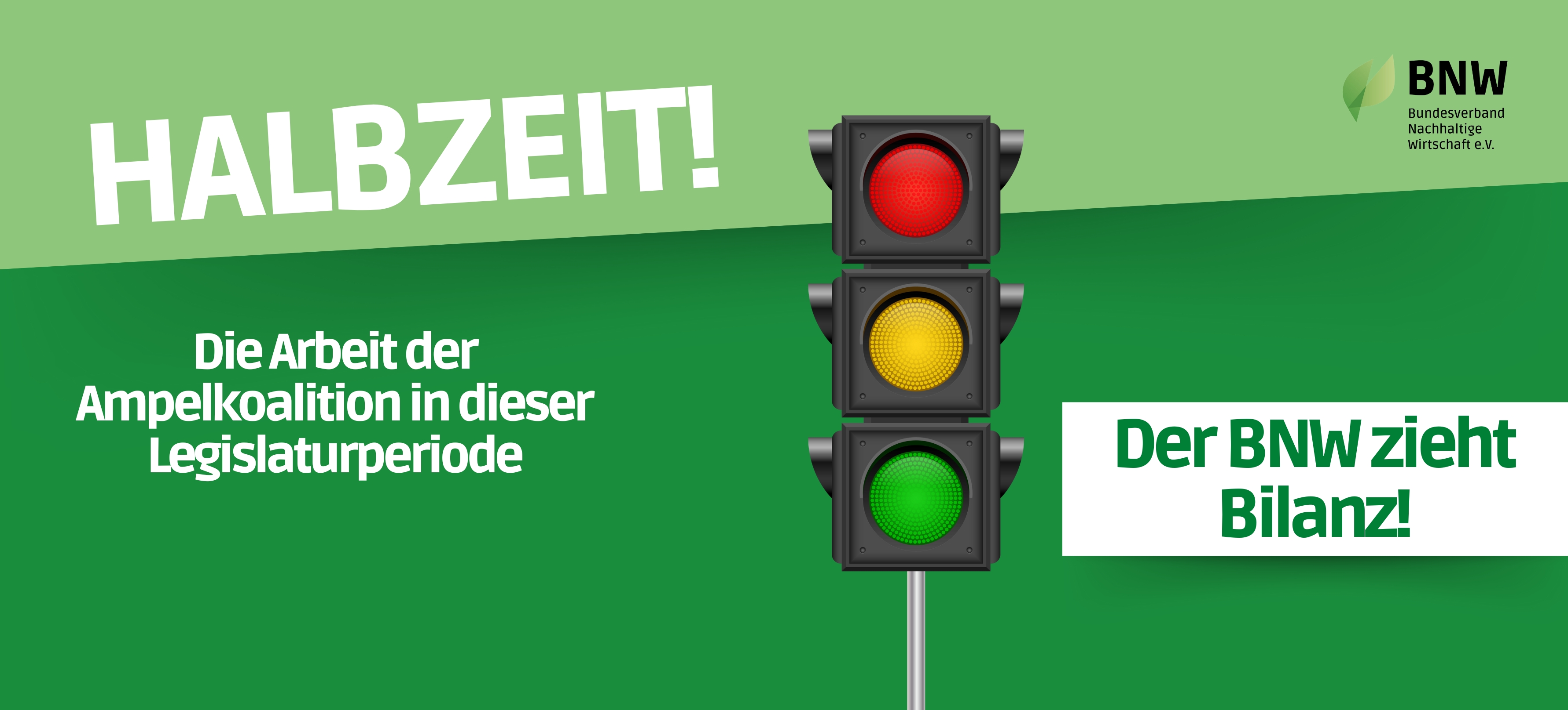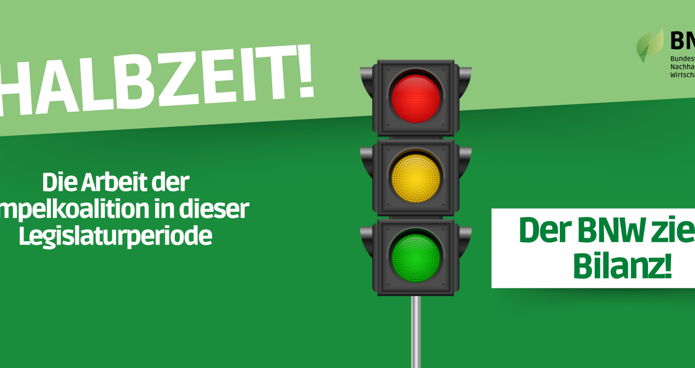 Die Bundesregierung hat vor zwei Jahren ihre Arbeit aufgenommen, das bedeutet Halbzeit der Legislaturperiode. Der BNW hat das zum Anlass genommen, ausgewählte im Koalitionsvertrag festgehaltene Vorhaben der Regierung auf deren Umsetzung zu analysieren. Im Fokus stehen die Bereiche Klimaschutz, Energie, Kreislaufwirtschaft, Verkehr, nachhaltiges Wirtschaften und Land- und Ernährungswirtschaft.