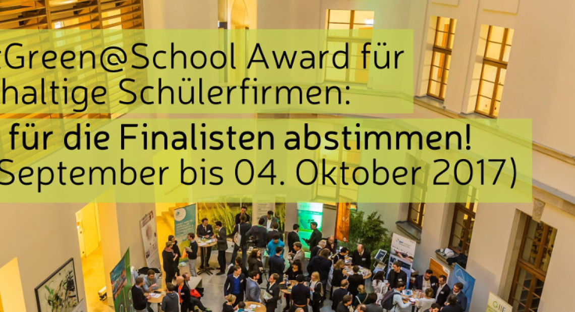 „Was für ein Engagement und eine Vielfalt!“ war das begeisterte Zwischenfazit der Jury des StartGreen@School Awards, mit dem in diesem Jahr zum ersten Mal die nachhaltigsten Schülerfirmen ausgezeichnet werden. Noch bis zum 04.10.2017 (24:00 Uhr) kann abgestimmt werden.