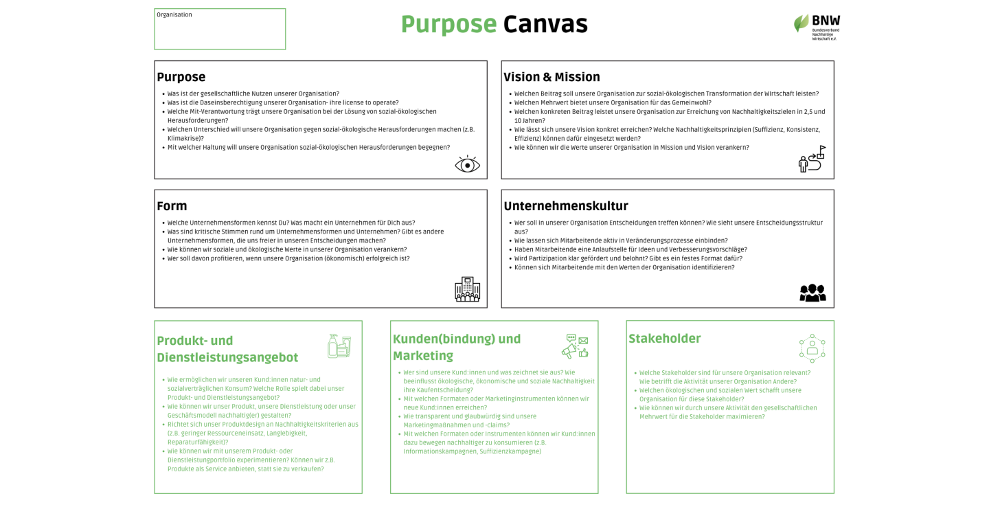 Purpose übersetzt bedeutet Zweck oder Sinn. Im unternehmerischen Kontext ist damit gemeint, dass sich Unternehmen einer tiefergehenden Unternehmensmission verpflichten. Im Gegensatz zum klassischen Shareholder-Ansatz steht bei Unternehmen der Purpose Economy Werteorientierung vor Profitorientierung. Die Pioniere der nachhaltigen Wirtschaftsweise zeichnet aus, dass sie die drei Themen Umwelt, Soziales und Wirtschaftlichkeit als gleichberechtigt betrachten. Viele Unternehmen, die sich einem nachhaltigen Unternehmenszweck verschrieben haben, kehren dem rein kapitalistischen Wirtschaftsverständnis den Rücken zu. Wenn Unternehmen nicht zum Wohl der Allgemeinheit und zum Erhalt unserer natürlichen Lebensgrundlagen beitragen verlieren sie künftig ihre License to operate. Unternehmen, die zukunftsorientiert Wirtschaften stellen soziale und ökologische Werte vor die reine Profitmaximierung.