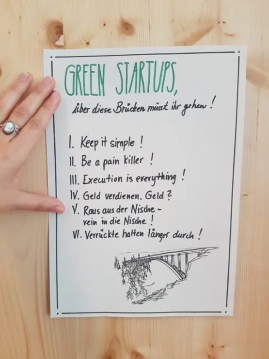 Nachhaltigkeit ist das Herzstück der Unternehmensphilosophie. Grüne Gründer:innen verbinden die vier Säulen der Nachhaltigkeit (Ökonomie, Ökologie, Soziales, Kultur) – und verändern mit ihren grünen Produkten und / oder Dienstleistungen die Welt. Beim Bundesverband Nachhaltige Wirtschaft sind Start-ups aus den Bereichen Erneuerbare Energien, E-Mobilität, Social Entrepreneurship, Clean Tech, nachhaltige Kommunikation und Bio-Lebensmittel vertreten.