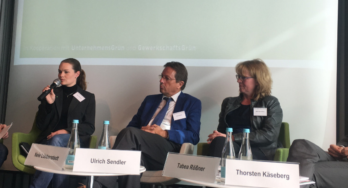 UnternehmensGrün richtete die Podiumsdiskussion „Ökonomische und ökologische Chancen der Digitalisierung“ aus. Dabei ging es u.a. darum, wie ökologische und ökonomische Anforderungen im fortschreitenden Prozess der Digitalisierung berücksichtigt werden können. Diese Fragen diskutierten Tabea Rößner, MdB, Bündnis 90 / Die Grünen, Sprecherin für Medien und Digitale Infrastruktur, Ulrich Sendler, Technologieanalyst und Autor, Nele Lübberstedt, kaneo GmbH - Green IT Solutions und Vorstand UnternehmensGrün und Dr. Thorsten Käseberg, Bundesministerium für Wirtschaft und Energie.